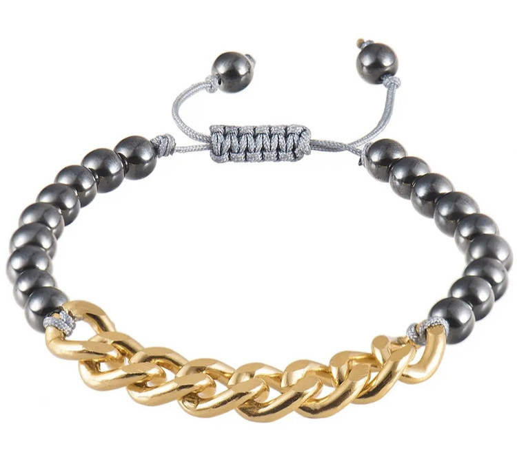 طراحی قابل تنظیم بند، استفاده راحت و فریسایز را فراهم میکند. تضاد رنگی بین مهرههای حدید و زنجیر طلایی، جلوهای چشمگیر به مچ دست میبخشد.