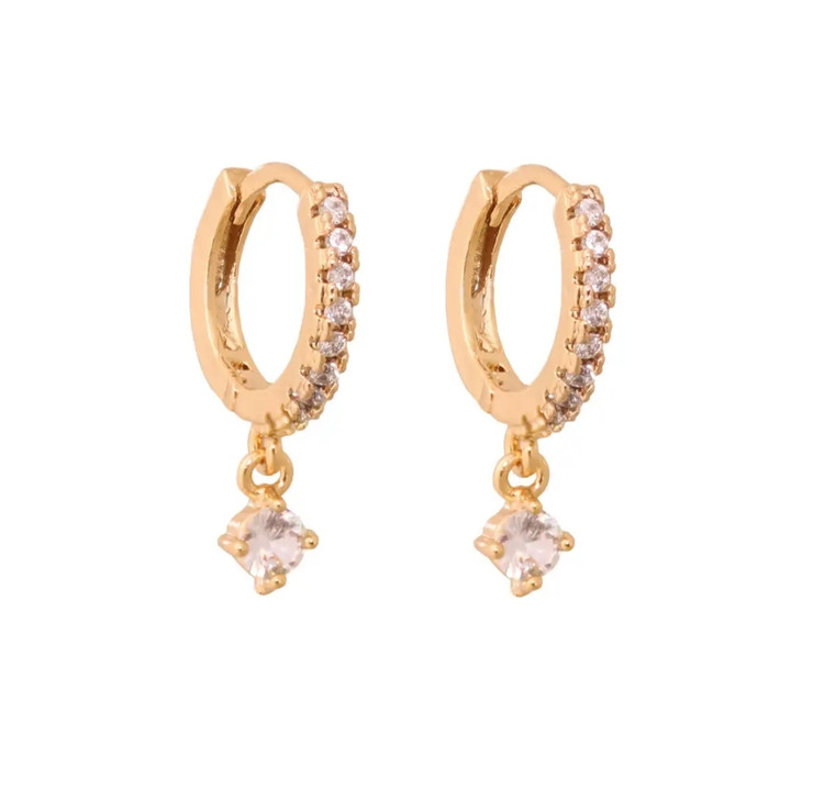 این گوشوارهها با طراحی حلقهای طلایی و نگینهای شفاف در امتداد لبه، جلوهای لوکس و چشمگیر به استایل شما میبخشند. آویز تکنگین در پایین هر گوشواره، حس لطافت و ظرافت را کامل میکند.